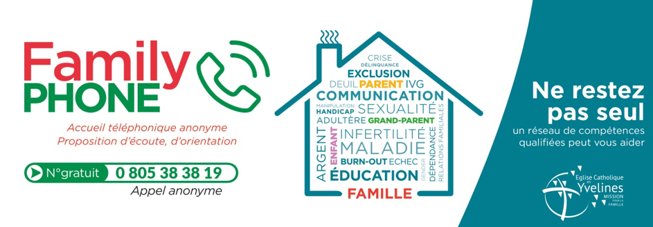 Le service FAMILYPHONE est un service confessionnel de l’église catholique, ouvert à tous, conçu et proposé par le service diocésain de la Mission pour la famille du diocèse de Versailles. Il s’agit d’un service d’accueil téléphonique anonyme qui offre un temps de 1ère écoute et d’orientation vers des compétences identifiées et qualifiées, pour toute personne, directement ou indirectement concernée par une difficulté familiale ou conjugale, quelle que soit la nature de la demande. Les compétences vers lesquelles la personne sera orientée sont de nature professionnelle (psychologues, juristes, avocats, médecins, médiateurs, conseillers conjugaux et familiaux, sexologues, assistantes sociales…) ou associative (mouvements d’Eglise, acteurs de la pastorale familiale…).